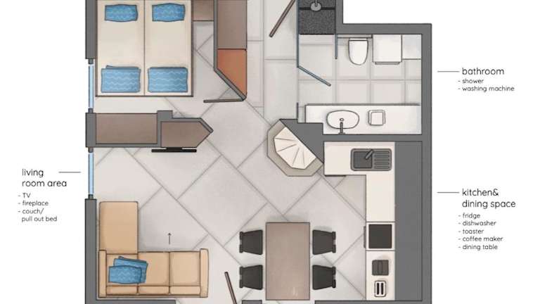Die Ferienwohnung verfügt über zwei Schlafzimmer, ein Wohnzimmer, eine voll ausgestattete Küche mit Kühlschrank und Kaffeemaschine sowie ein Badezimmer mit Dusche und Haartrockner. Zudem stehen Handtücher und Bettwäsche bereit.