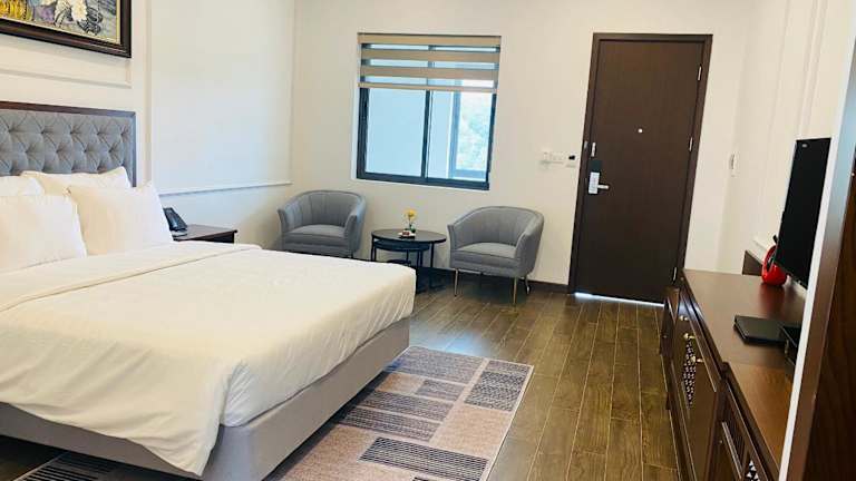 Die klimatisierten Zimmer sind ausgestattet mit einem Schreibtisch, einem Wasserkocher, einem Kühlschrank, einem Safe, einem Flachbild-TV sowie einem eigenen Badezimmer mit Bidet. Die Zimmer verfügen über Bettwäsche.