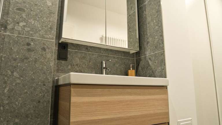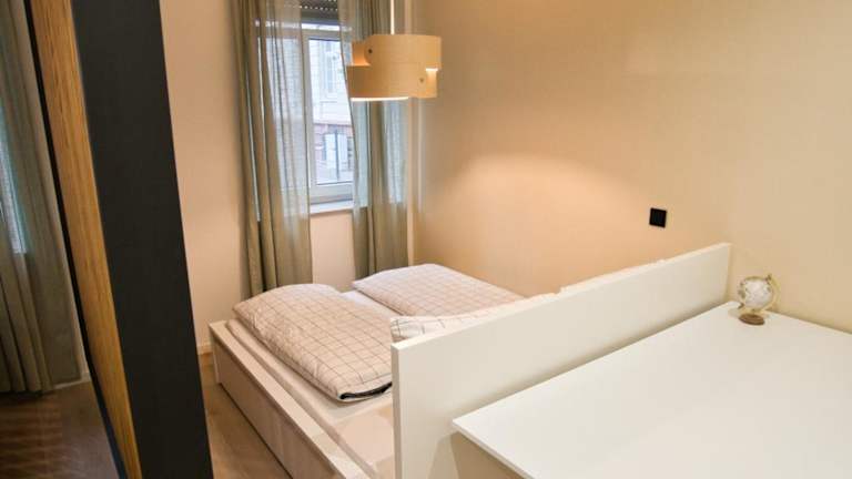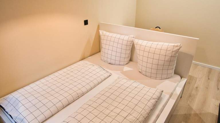 Die Ferienwohnung umfasst zwei Schlafzimmer, eine voll ausgestattete Küche mit Kühlschrank und Geschirrspüler, einen Flachbild-TV, einen Sitzbereich sowie ein Badezimmer mit Dusche. Handtücher und Bettwäsche sind ebenfalls vorhanden.