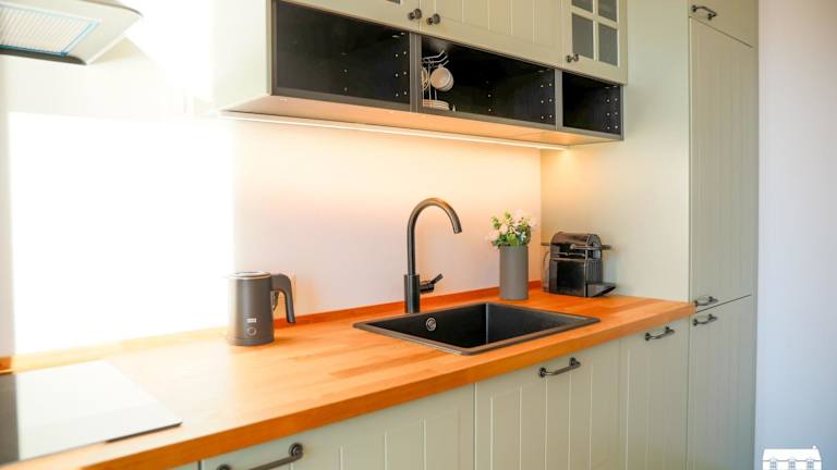 Die Ferienwohnung bietet ein separates Schlafzimmer, eine voll ausgestattete Küche mit Kühlschrank und Herdplatte sowie ein Badezimmer. Handtücher und Bettwäsche sind ebenfalls vorhanden.