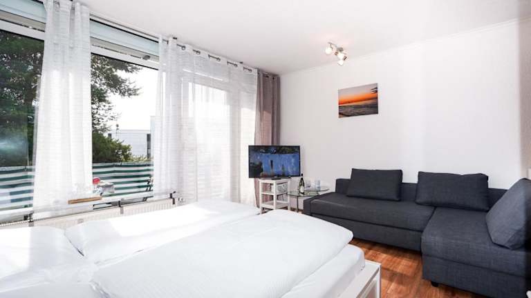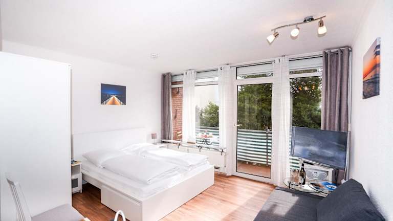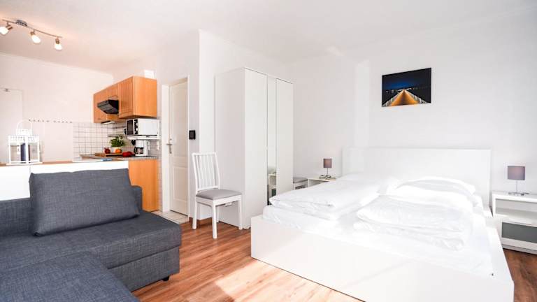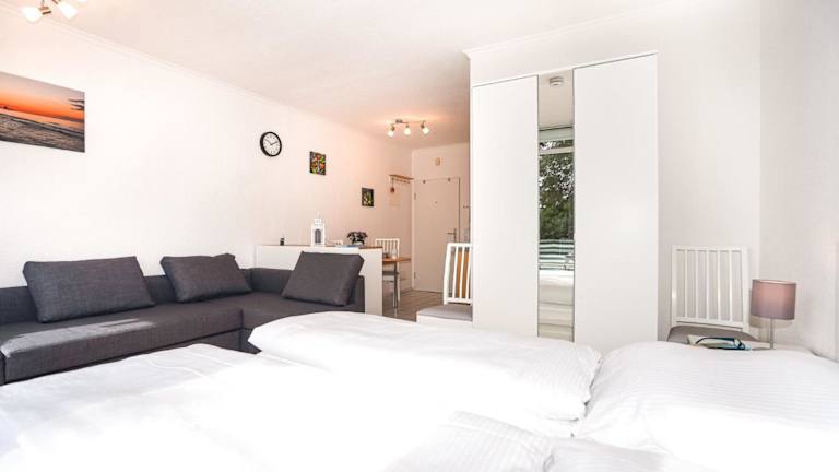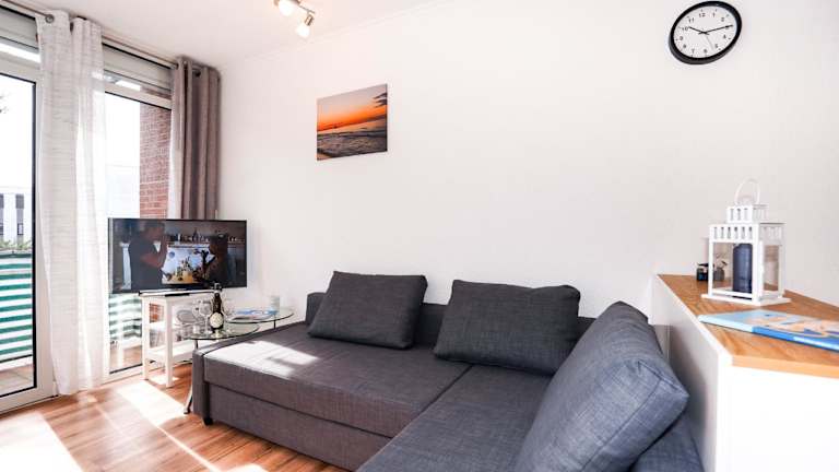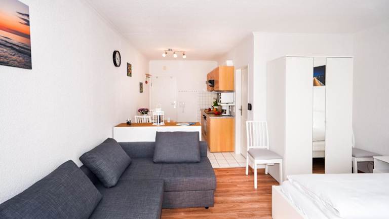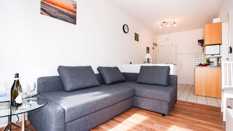 Die Ferienwohnung verfügt über einen Satelliten-Flachbild-TV und ein Wohnzimmer. Die Küchenzeile beinhaltet einen Kühlschrank, einen Ofen, eine Mikrowelle sowie eine Kaffeemaschine und einen Wasserkocher.