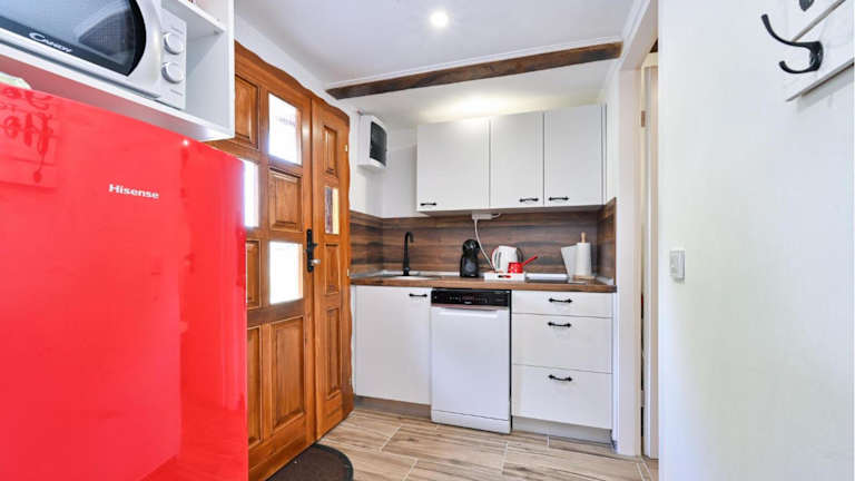 Das Ferienhaus verfügt über 2 Schlafzimmer, einen Flachbild-TV und eine voll ausgestattete Küche mit Kühlschrank und Geschirrspüler.