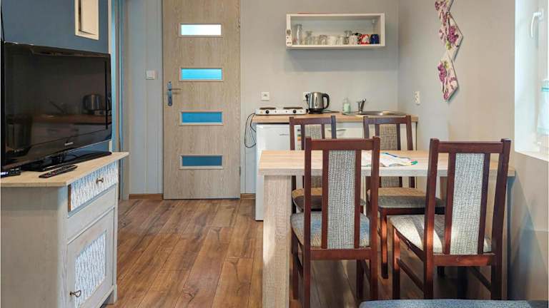Das Ferienhaus besteht aus zwei Schlafzimmern, einem Wohnzimmer mit einem TV, einer voll ausgestatteten Küche mit Kühlschrank und Herdplatte sowie einem Badezimmer mit Dusche. Es gibt auch eine Heizung und Rauchmelder, um den Aufenthalt sicherer zu gestalten.