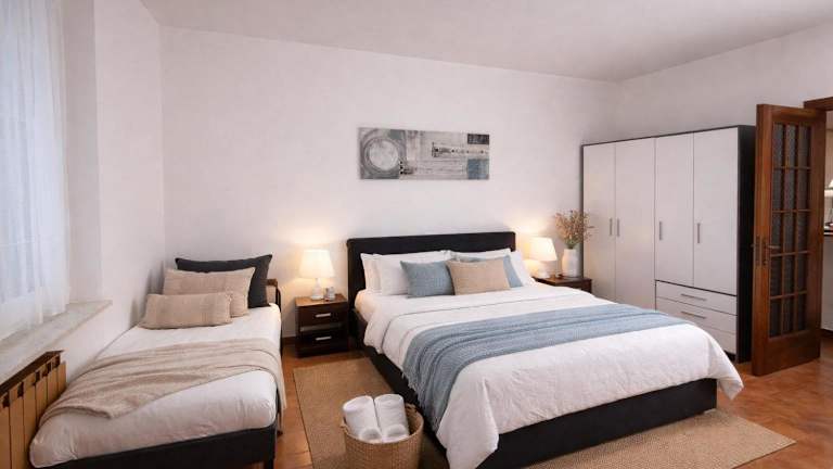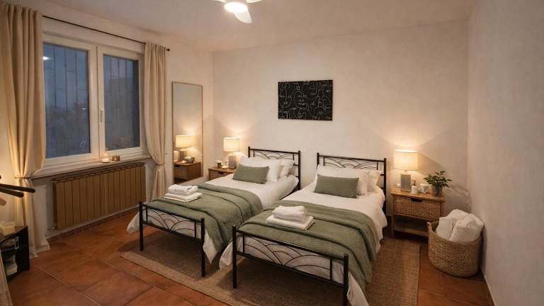 Die Ferienwohnung umfasst eine voll ausgestattete Küche mit Kühlschrank, Geschirrspüler und Ofen. Das Wohnzimmer bietet sowohl einen Sitzbereich als auch einen Essbereich. Es gibt zwei Schlafzimmer sowie ein Badezimmer, das mit einem Bidet und einer Dusche ausgestattet ist. Handtücher und Bettwäsche werden bereitgestellt.