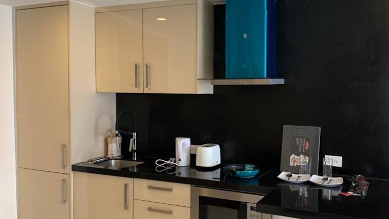 Die Zimmer sind mit einer Terrasse, einer voll ausgestatteten Küche, einschließlich Kühlschrank, Mikrowelle, Herdplatte und Toaster ausgestattet. Zudem bieten sie einen Essbereich und einen Flachbild-TV. Jedes Zimmer verfügt über ein eigenes Badezimmer mit Dusche und Haartrockner.
