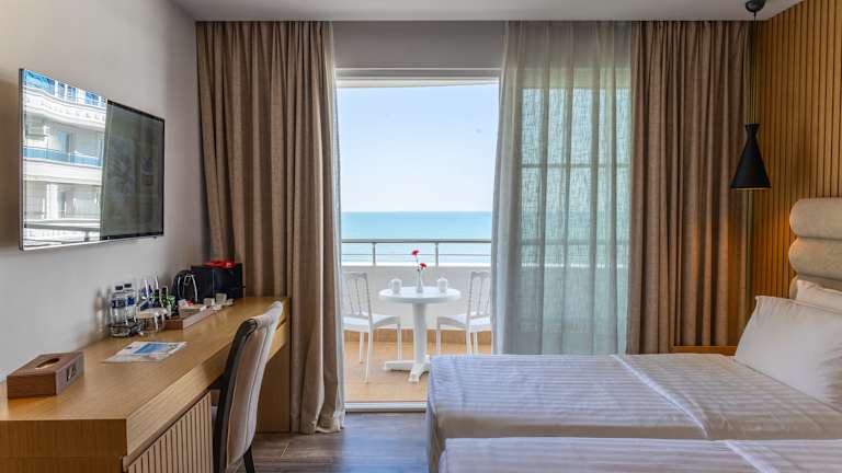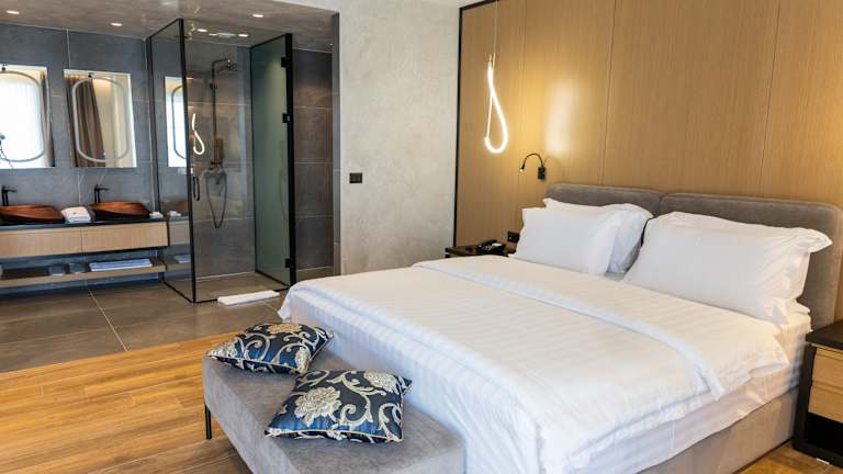 Die Zimmer sind elegant und hell, mit modernem Dekor und Komfort. Viele bieten Meer- oder Poolblick, großzügige Balkone, hochwertige Bettwäsche, Klimaanlage und Annehmlichkeiten für einen entspannten Aufenthalt.