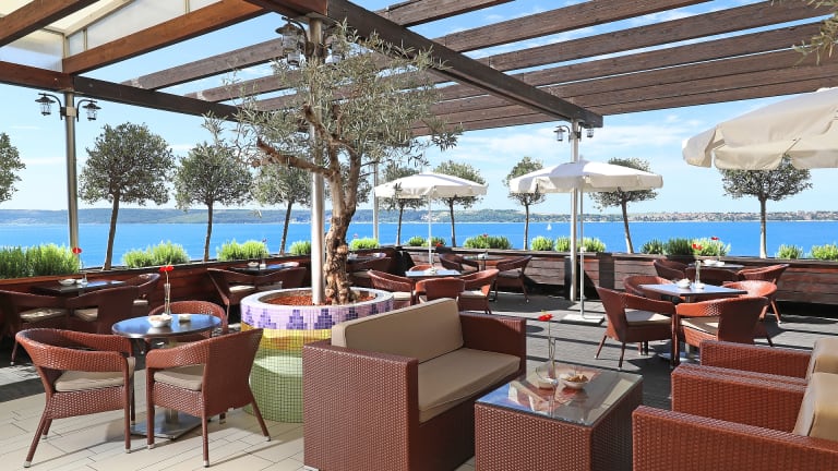 Das Restaurant Sunset befindet sich auf der 10. Etage des Grand Hotels Bernardin. Es bietet eine Vielzahl von mediterranen Gerichten und einen herrlichen Blick auf Meer. Die bedeckte Terrasse Grand Garden im Grand Hotel Bernardin bietet einen herrlichen Blick auf die Bucht von Piran. Sonnenscheine und Meeresrauchen wirken wohltuend auf das Wohlbefinden. Lassen Sie sich Nachmittagskaffee, ausgezeichnete Weine oder andere erfrischende Getränke schmecken. Unsere Barmänner vorbereiten schmackhafte Cocktails. Auf der Terrasse kann man auch Cocktail Partys organisieren. Für eine Party oder Empfang vorbereiten unsere Chefs verschiedene ausgezeichnete Delikatessen. Außerdem ist die Terrasse mit ihrer Lage ein traumhafter Punkt, wo man eine unvergessliche Hochzeitsfeier organisieren kann. Lassen Sie Ihren Gaumen verwöhnen mit Desserts, Kuchen, Torten, Saisonsalaten und anderen kleinen Gerichten. Im Café San Bernardino des Hotels Histrion können Sie beim Morgenkaffee, Nachmittagstee oder einem Gläschen ausgesuchter Getränke plaudern. Bei schönem Wetter steht Ihnen die ruhige Hotelterrasse zur Verfügung, wo Sie dem Meeresrauschen zuhören können. Am Strand des Grand Hotels Bernardin können Sie sich in der Tropic Bar mit verschiedenen Getränken erfrischen. Sie können zwischen einer Vielzahl von Cocktails, Likören und anderen erfrischenden Getränken wählen. Außerdem bietet die Bar eine breite Auswahl an Snacks, belegten Brötchen und geschmackvollen Kuchen.