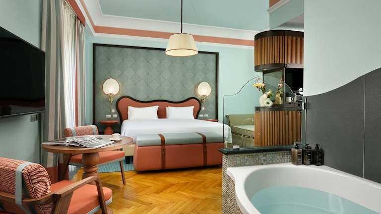 The newly renovated rooms evoke maritime atmospheres, especially through their colours. Each space is characterized by a distinctive shade: from sea green to coral, and the soft yellow of sand. The style recalls the typical shapes of Belle Époque furnishings, reinterpreted with a contemporary twist. The furnishings are strictly Made in Italy and crafted by skilled artisans, as are the light design elements and the wall coverings, which were chosen with particular attention to materials and details. Each room thus conveys an authentic, unique, and profoundly Italian elegance
