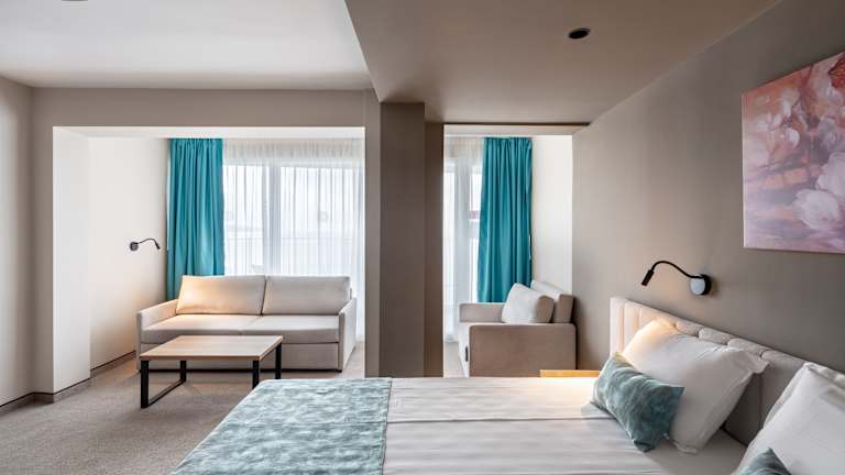 Die klimatisierten Zimmer im Grand Hotel Sunny Beach sind geschmackvoll eingerichtet und bieten seitlichen oder direkten Meerblick. Die Zimmer verfügen über Kabel-TV, einen Balkon und ein eigenes Bad mit Dusche und kostenfreien Pflegeprodukten. Eine Minibar und kostenfreies WLAN sind ebenfalls vorhanden.
