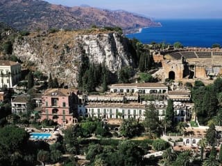 Das Grand Hotel Timeo, A Belmond Hotel, Taormina liegt gegenüber dem Griechischen Theater in Taormina und bietet einen spektakulären Blick auf den Ätna und die sizilianische Küste. Das Hotel befindet sich in einer zentralen Lage und ist umgeben von einer malerischen Landschaft. Das Zentrum von Taormina ist leicht zu Fuß erreichbar und der Strand des Hotels Villa Sant Andrea in der Mazzarò-Bucht kann bequem mit dem kostenlosen Shuttle erreicht werden.