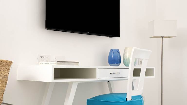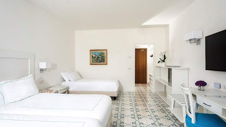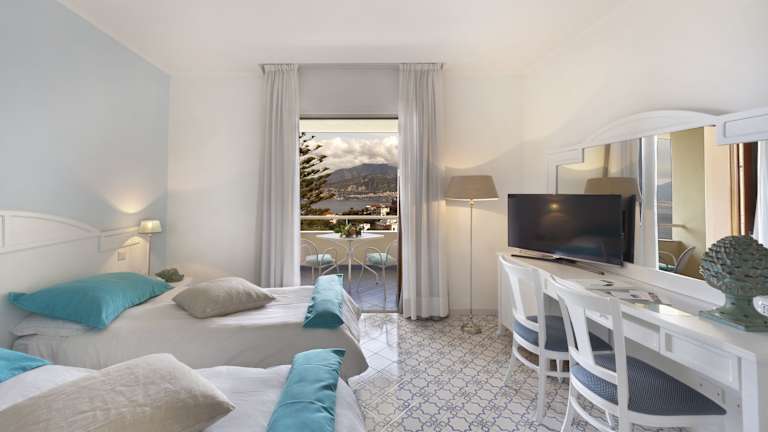 Das Hotel verfügt über 250 Zimmer auf 4 Etagen, die mit einem Aufzug erreichbar sind. Die Zimmer sind hell und geräumig, mit Fliesenböden und klassischen Möbeln eingerichtet. Jedes Zimmer ist klimatisiert und verfügt über einen TV, eine Minibar und ein eigenes Bad mit Pflegeprodukten. Einige Zimmer bieten auch einen Balkon oder eine Terrasse mit Meerblick.