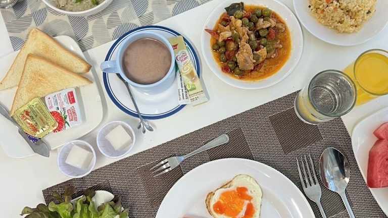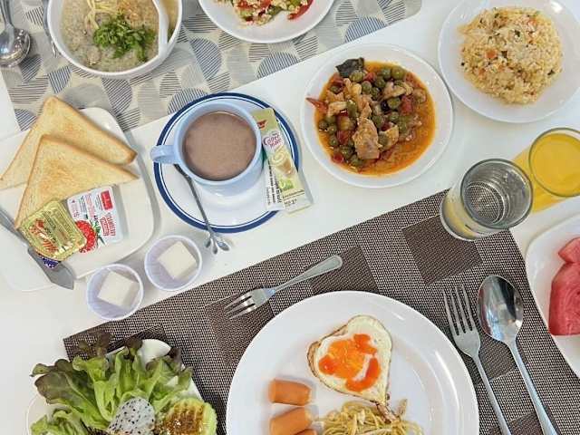 Gäste können ein Buffet zum Frühstück genießen.