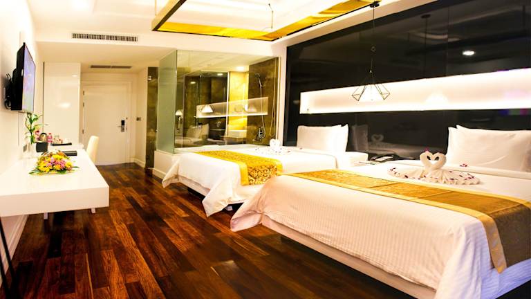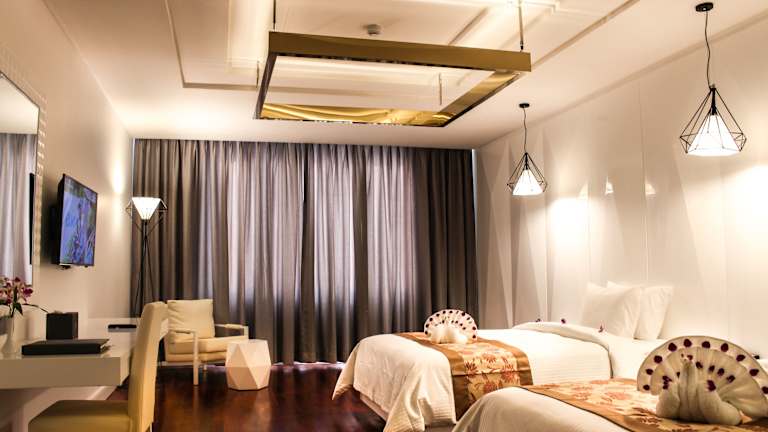 Das Hotel in Siem Reap bietet seinen Gästen eine freundliche Atmosphäre und zahlreiche Annehmlichkeiten für einen angenehmen Aufenthalt. Das Personal an der Rezeption ist hilfsbereit und steht Ihnen bei Fragen gerne zur Verfügung. Das Hotel verfügt über einen Poolbereich mit Innen- und Außenbecken sowie einen Wellnessbereich mit Whirlpool, Sauna und Massageangeboten. Drei Restaurants und ein Café bieten kulinarische Vielfalt, und für Familien stehen Babysitterservice und Kinderbetreuung zur Verfügung. Die Zimmer sind komfortabel ausgestattet und es gibt auch rollstuhlgerechte Zimmer.