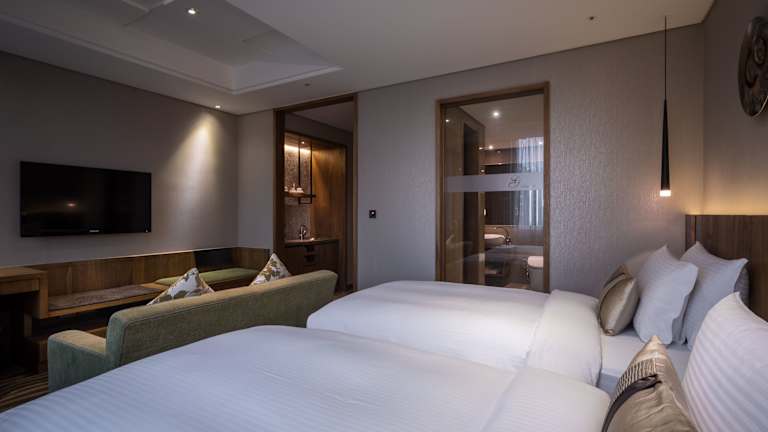 Die Zimmer im Green World Hotel Jian Pei Suites sind modern und komfortabel eingerichtet. Jedes Zimmer verfügt über eine Klimaanlage, einen Flachbild-Kabel-TV, einen Wasserkocher und eine Minibar. Das geräumige Badezimmer ist mit einer Dusche und kostenfreien Pflegeprodukten ausgestattet. Einige Zimmer bieten zudem ein Sofa und einen schönen Blick auf die Stadt.