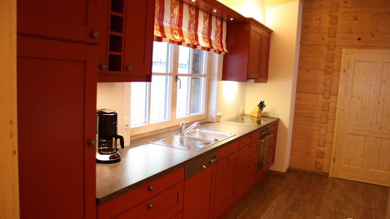 Das Ferienhaus umfasst eine voll ausgestattete Küche mit einem Kühlschrank und einem Essbereich, um den Gästen eine eigene Verpflegung zu ermöglichen.