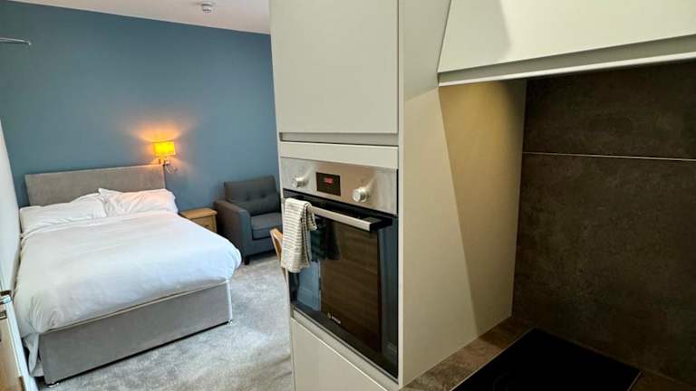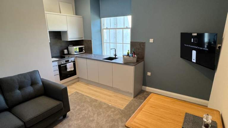 In den Apartments ist eine voll ausgestattete Küchenzeile vorhanden, die einen Kühlschrank, Geschirrspüler, Ofen und Wasserkocher umfasst. Ein Esstisch ermöglicht die Zubereitung und den Genuss eigener Mahlzeiten.