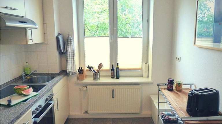 Die Ferienwohnung verfügt über eine Küchenzeile, die mit einem Kühlschrank, einem Geschirrspüler und einer Kaffeemaschine ausgestattet ist. Handtücher und Bettwäsche werden bereitgestellt.