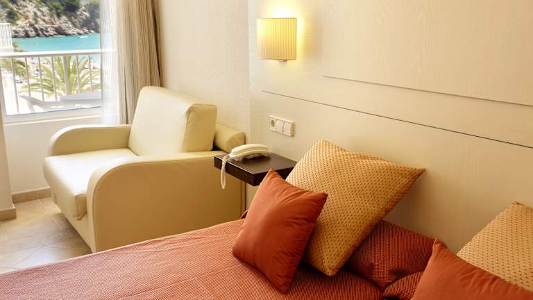 Das Hotel bietet verschiedene Zimmertypen wie Doppelzimmer mit frontalem oder seitlichem Meerblick sowie Zimmer zur Landseite, jeweils ausgestattet mit Klimaanlage, Safe (gegen Gebühr), Kühlschrank, WLAN und Fernseher. Doppelzimmer haben einen Balkon mit Sitzgelegenheit. Der Reinigungsservice wird täglich angeboten.