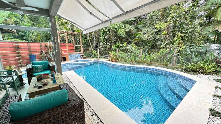 Das Sobrado cinematográfico muito moderno em condomínio junto a Riviera de São Lourenço - Bertioga SP bietet eine moderne und komfortable Unterkunft in Bertioga. Mit einem Außenpool, einem Garten und einer Gemeinschaftslounge können die Gäste entspannen und die Annehmlichkeiten der Unterkunft genießen. Die Unterkunft verfügt über kostenfreies WLAN und bietet einen herrlichen Blick auf den Pool. Das Ferienhaus ist geräumig und gut ausgestattet, mit 4 Schlafzimmern, einem Wohnzimmer, einer voll ausgestatteten Küche und 6 Badezimmern. Ein Balkon und kostenfreie Privatparkplätze sind ebenfalls vorhanden. Der Strand Praia de Itaguaré und der Park Restingas des Estadual Bertioga sind in der Nähe und bieten Möglichkeiten für Outdoor-Aktivitäten.