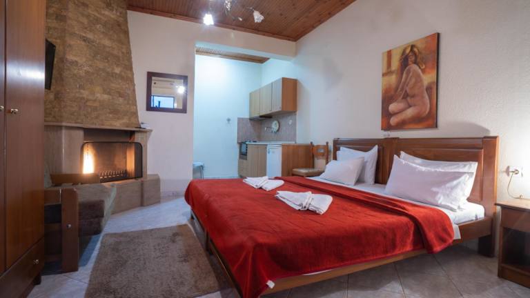 Die Studios im Guesthouse Adonis sind gemütlich und komfortabel eingerichtet und verfügen über eine kleine Küchenzeile mit einer Kochgelegenheit, einer Kaffeemaschine und einem Kühlschrank. Jede Unterkunft ist mit einem Flachbild-Sat-TV ausgestattet und einige Studios bieten sogar einen Kamin, der für eine zusätzliche gemütliche Atmosphäre sorgt. Der Balkon bietet einen herrlichen Blick auf den Garten und die umliegenden Berge, perfekt zum Entspannen und Genießen der Natur.