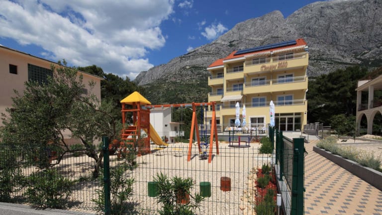 Das Hotel Dorijini Dvori liegt nur 450 m vom Strand von Baška Voda entfernt, der mit dem Umweltzeichen Blaue Flagge ausgezeichnet wurde. Dies bedeutet, dass der Strand sauber und sicher ist und eine hohe Wasserqualität bietet. Die Lage des Hotels ist ideal, um die Schönheit der kroatischen Küste zu genießen und das kristallklare Wasser der Adria zu erkunden. In nur 5 Gehminuten erreichen Sie das Zentrum von Baška Voda, wo Sie eine Vielzahl von Museen, Restaurants und Cafés finden. Die örtliche Bushaltestelle liegt ebenfalls in unmittelbarer Nähe und bietet Ihnen eine bequeme Anbindung an die umliegenden Städte und Sehenswürdigkeiten. Für Naturliebhaber bietet das nahegelegene Biokovo-Gebirge zahlreiche Möglichkeiten zum Wandern und Mountainbikefahren.