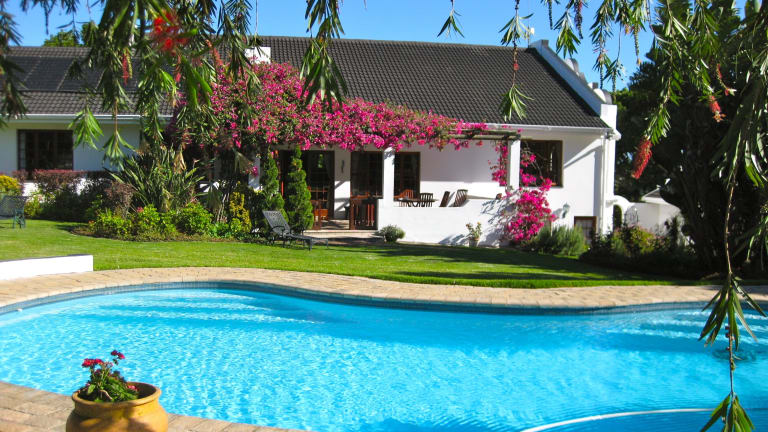 4 Star Luxury Country House, Ideal for golfing stays, in the heart of the Garden Route. Surrounded by spectacular mountain scenery, and tranquil setting. South Africas' No. 1 Golf course, the links at Fancourt, plus its two other courses, are just 1.5 kms, with 3 other 18 hole courses nearby. Close to long sandy beaches and sheltered coves, George Airport and shopping centre. A solar heated swimming pool in a large mature garden, visiting birds is the perfect place to relax.