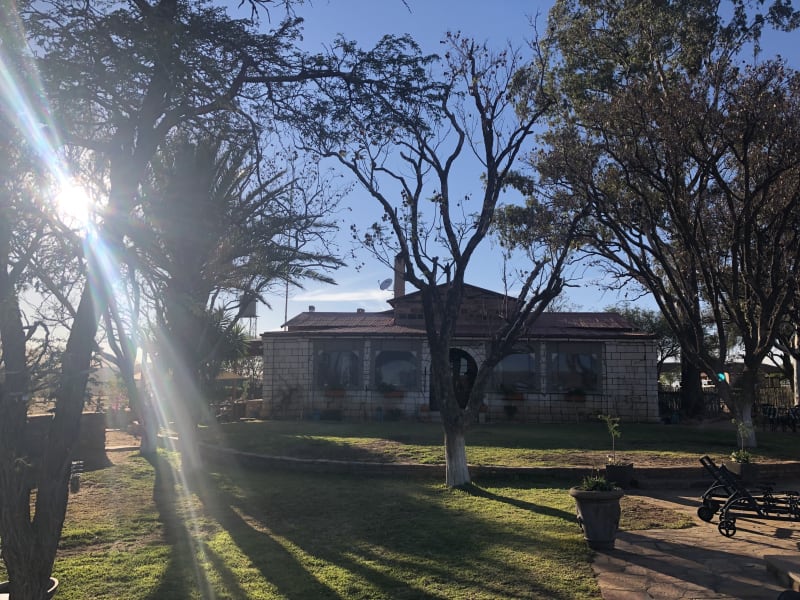 Wir bieten Farmrundfahrten an, auf der Farm befinden sich Giraffen direkt hinter der Pool Mauer, Antilopen wie Kudu, Oryx, Kuh- Antilopen, Wasserböcke, Impala, Bergzebras und vieles mehr findet man auf einer Fläche von 7500 Hektar. Mit dem Quadbike kann man auch selbst die Farm erkunden und die herrliche Landschaft genießen Reitausflüge werden auch angeboten, sollten aber vorher reserviert werden. Einen wunderschöne Pool Landschaft im Garten des Hauses lädt zum verweilen ein. Es stehen viele Bücher bereit, von der historischen Geschichte des Hauses bis zu heutigen Namibia Bestsellern oder Reiseführern