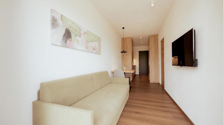 Die Zimmer in der Unterkunft sind mit einer voll ausgestatteten Küchenzeile ausgestattet, die einen Kühlschrank, Geschirrspüler, Mikrowelle, Herdplatte, Toaster, Kaffeemaschine und Wasserkocher umfasst. Zudem gibt es ein eigenes Badezimmer mit Dusche und Haartrockner. Alle Zimmer sind schallisoliert und verfügen über Klimaanlage sowie Heizung.