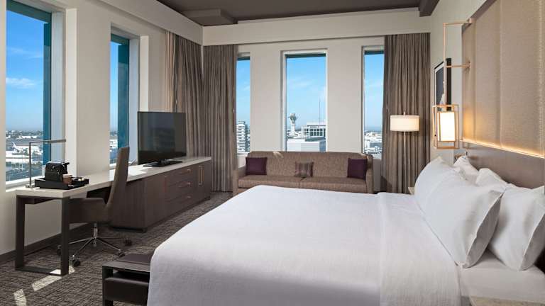 Die Zimmer im H Hotel Los Angeles, Curio Collection by Hilton sind geräumig und stilvoll eingerichtet. Sie bieten entweder ein Kingsize-Bett oder zwei Queensize-Betten sowie Annehmlichkeiten wie kostenloses WLAN, einen 55-Zoll-HD-TV, Premium-Kabel-TV, einen Getränkekühler, eine Nespresso-Maschine, Pflegeprodukte von Temple Spa und einen Schreibtisch mit ergonomischem Stuhl. Es stehen auch Suiten mit einem Schlafzimmer zur Verfügung.