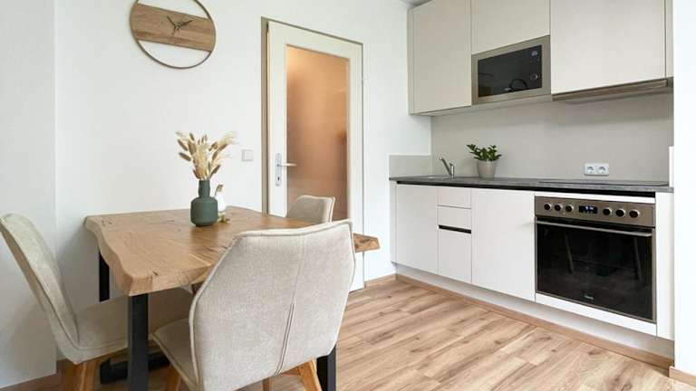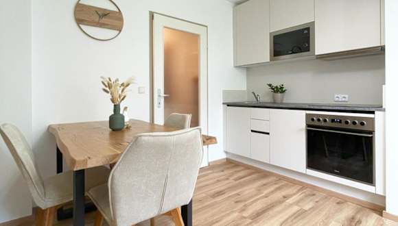 Die Ferienwohnung umfasst ein Schlafzimmer, ein Wohnzimmer und eine voll ausgestattete Küche mit Kühlschrank und Kaffeemaschine. Zur Ausstattung gehört auch ein Badezimmer mit Dusche und Haartrockner. Handtücher und Bettwäsche werden bereitgestellt.