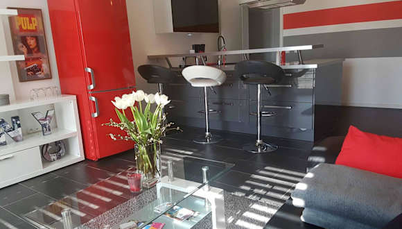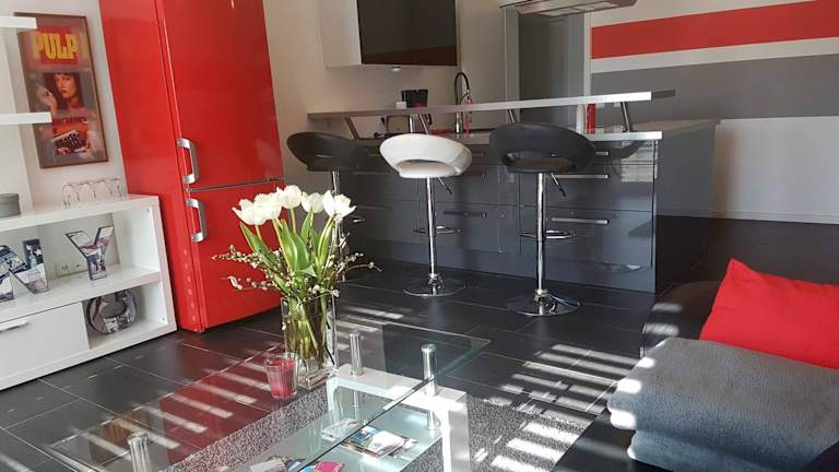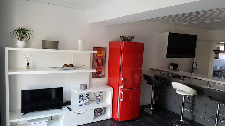 Die Ferienwohnung umfasst ein Schlafzimmer, eine gut ausgestattete Küchenzeile mit Kühlschrank und Ofen, ein Wohnzimmer sowie einen Flachbild-TV. Handtücher und Bettwäsche werden bereitgestellt.