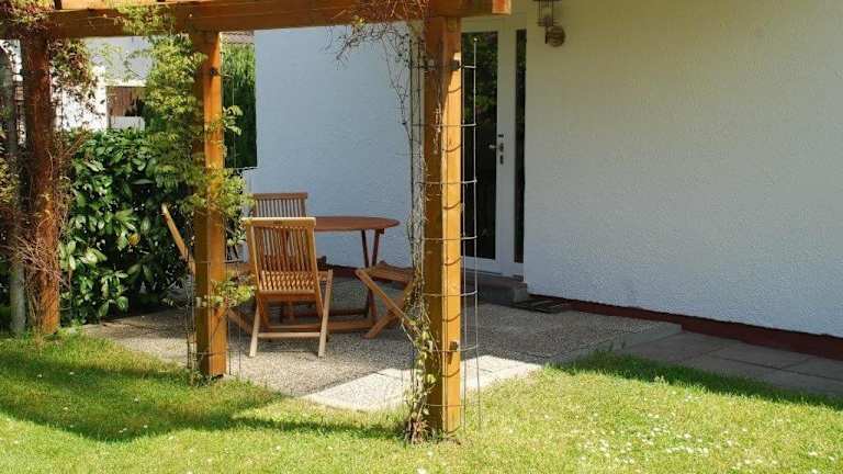 Die Ferienwohnung besteht aus einem Schlafzimmer, einem Wohnzimmer und einer voll ausgestatteten Küche, die mit einem Kühlschrank und einer Kaffeemaschine ausgestattet ist. Ein Badezimmer mit Dusche ist ebenfalls vorhanden. Die Unterkunft bietet eine Terrasse und Gartenmöbel.