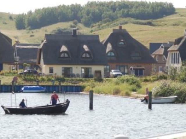 Diese schöne Reetdachhaus ist für bis zu 6 Personen ideal geeignet. 1 großer Wohnraum mit einer gemütlichen Sitzecke vor dem Kamin, einer Küchenzeile im Wohnbereich und einem Esstisch sowie ein Duschbad erwarten Sie im Erdgeschoß des ca. 125 m² großen Nichtraucherhauses. Im Dachgeschoß sind die drei Schlafzimmer jeweils mit 1 Doppelbett und ein weiteres Bad mit Badewanne untergebracht. Die große Terasse eröffnet den Blick auf das Boddengewässer und den Hafen. 2 PKW-Stellplätze sind vorhanden und 1 wohlerzogenes Haustier ist hier willkommen!