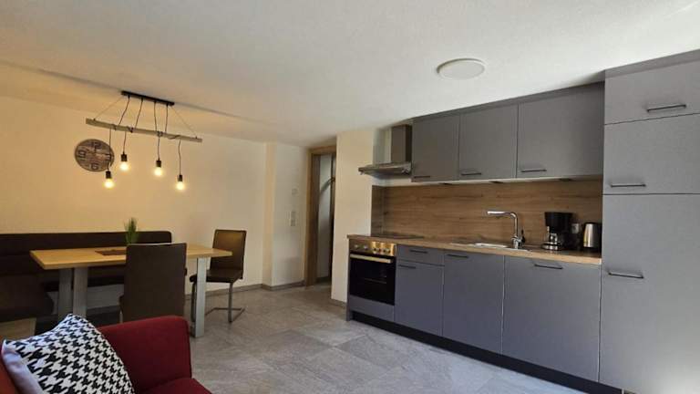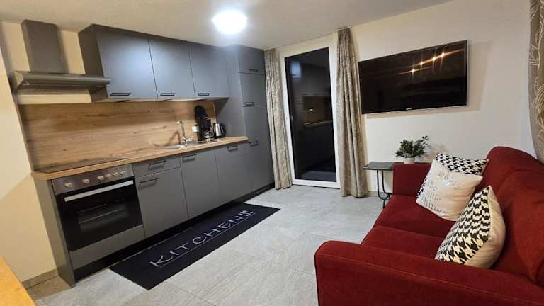 Die Appartements sind mit Küchen ausgestattet, die Kühlschrank, Geschirrspüler, Ofen sowie Herdplatte, Kaffeemaschine und Wasserkocher umfassen.