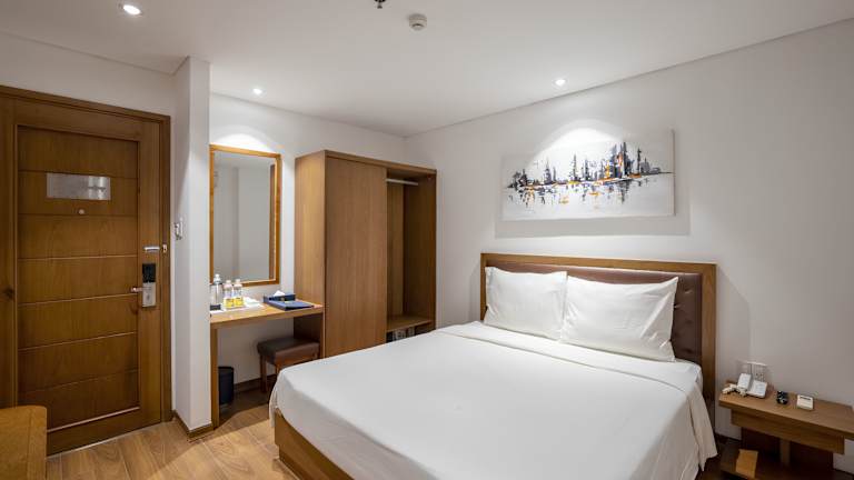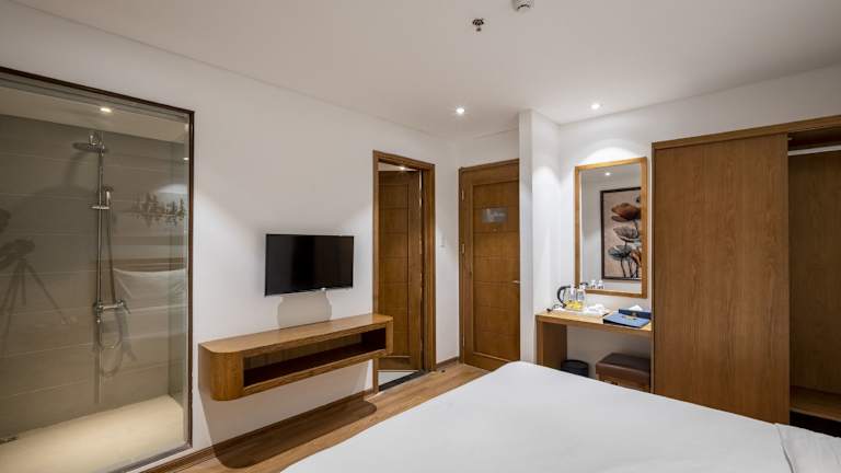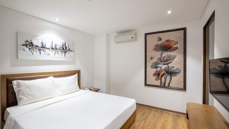 Die Zimmer im Hai Trieu Hotel sind klimatisiert und bieten eine komfortable Ausstattung. Jedes Zimmer verfügt über einen Schreibtisch, einen Wasserkocher, einen Kühlschrank, eine Minibar, einen Safe und einen Flachbild-TV. Das private Badezimmer ist mit einem Bidet ausgestattet und Handtücher und Bettwäsche werden gestellt.