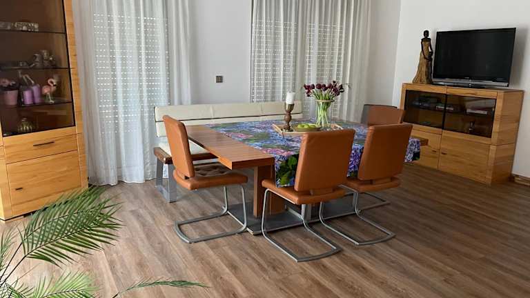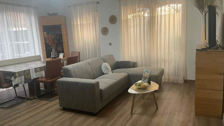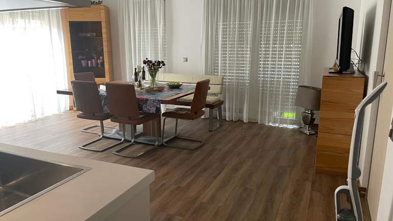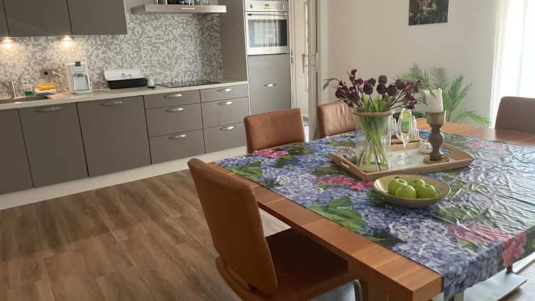 Die Ferienwohnung bietet 2 Schlafzimmer, ein Wohnzimmer, einen Flachbild-TV sowie eine gut ausgestattete Küche mit einem Kühlschrank und einem Geschirrspüler. Zudem stehen ein Badezimmer mit Dusche sowie Handtücher und Bettwäsche zur Verfügung. Die Unterkunft bietet eine Terrasse mit Blick auf den Garten.
