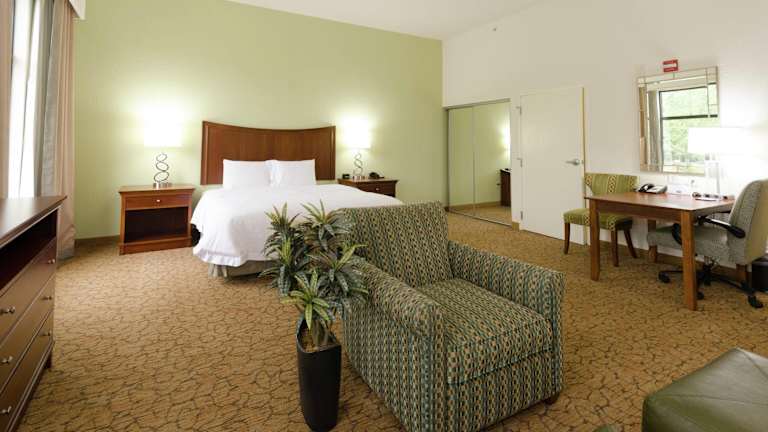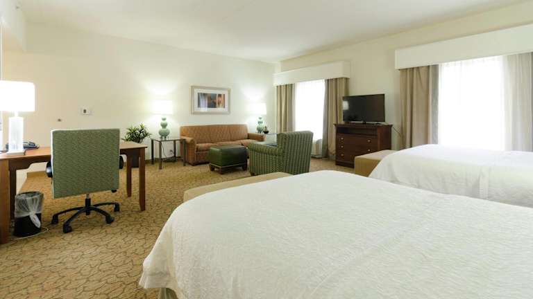 Die Zimmer im Hampton Inn sind geräumig und in neutralen Farben gehalten. Sie bieten eine komfortable und moderne Ausstattung mit Flachbild-TVs, einer Kaffeemaschine, einer Mikrowelle und einem kleinen Kühlschrank. Jedes Zimmer verfügt über einen Schreibtisch und kostenfreies WLAN. Die Einrichtung der Zimmer ist schlicht und modern, um den Gästen einen angenehmen Aufenthalt zu ermöglichen.