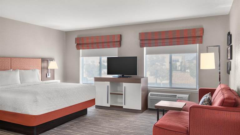 Die Unterkünfte im Hampton Inn & Suites Fresno sind komfortabel eingerichtet und verfügen über Annehmlichkeiten wie eine Mikrowelle und einen Minikühlschrank. Die Zimmer sind mit Teppichböden, einem Kingsize-Bett und einem Sofabett ausgestattet. Zur weiteren Ausstattung gehören eine Minibar, ein Schreibtisch, ein Kühlschrank, eine Mikrowelle, eine Tee-/Kaffeemaschine, ein Bügelset, ein Telefon, ein TV-Gerät mit Satelliten-/Kabelempfang, ein Radio und kostenfreies WLAN. Die Badezimmer bieten eine Dusche oder Badewanne, einen Haartrockner und kostenlose Kosmetikartikel.