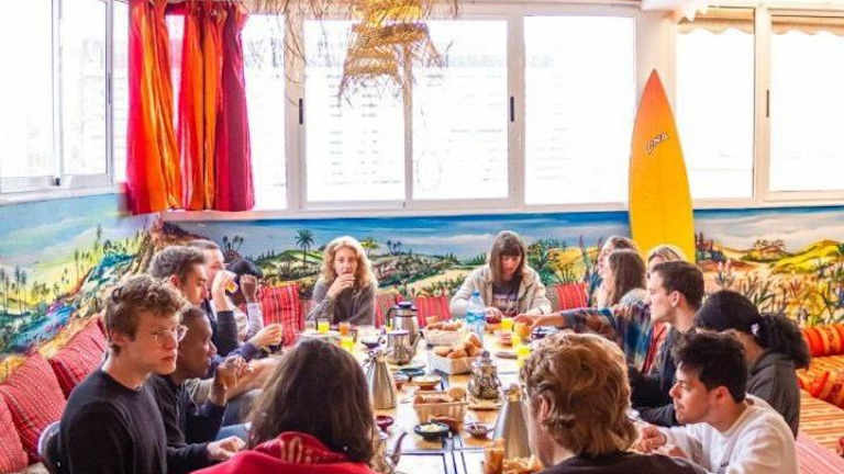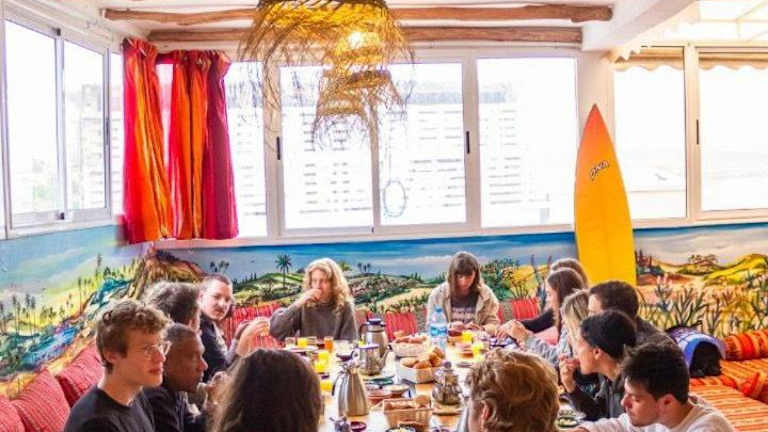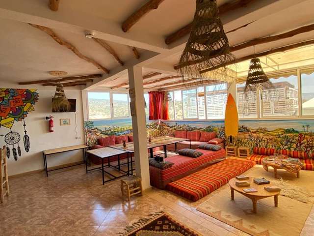 Das Happy Surf Hostel befindet sich im Zentrum von Taghazout, weniger als 400 m vom Strand Taghazout und 1,9 km vom Strand Madraba entfernt. Die Unterkunft ist 4,3 km vom Golf Tazegzout sowie 8,4 km vom Atlantica Parc Aquatique entfernt. Weitere Sehenswürdigkeiten in der Nähe sind der 18 km entfernte Hafen von Agadir, das Amazighe Heritage Museum in 21 km und die Medina Polizzi in 25 km. Der Flughafen Al Massira ist 40 km entfernt.