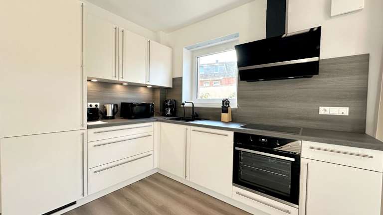 Essenslieferung in die Unterkunft möglich. Eine voll ausgestattete Küche steht zur Verfügung, inklusive Kühlschrank, Kaffeemaschine, Geschirrspüler, Ofen, Mikrowelle und Wasserkocher.