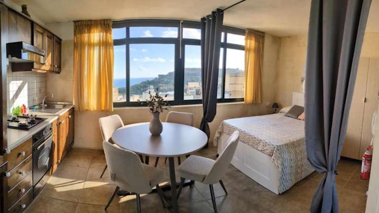 Harruba Flt 3 Triq il Gudja bietet klimatisierte Übernachtungsmöglichkeiten und einen Balkon. Die Unterkunft verfügt über Meerblick und ist ausgestattet mit modernen Annehmlichkeiten.