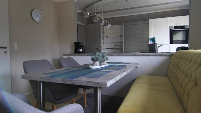 Essenslieferung in die Unterkunft ist möglich. In der voll ausgestatteten Küche stehen ein Kühlschrank, ein Geschirrspüler, ein Ofen und eine Kaffeemaschine zur Verfügung.
