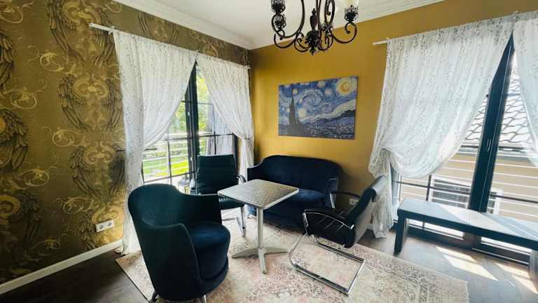 Die Ferienwohnung umfasst eine voll ausgestattete Küche mit Kühlschrank und Kaffeemaschine, die das Zubereiten von Mahlzeiten ermöglicht. Außerdem gibt es ein Café vor Ort, und Gäste haben die Möglichkeit, Essen in die Unterkunft liefern zu lassen. Für zusätzlichen Komfort besteht die Möglichkeit, Frühstücks-Behälter zum Mitnehmen zu nutzen.