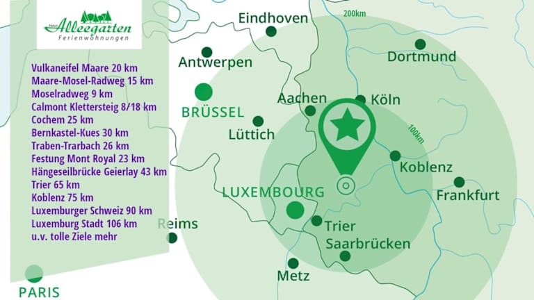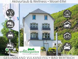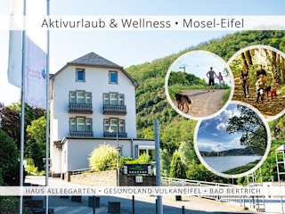 Die Unterkunft Haus Alleegarten befindet sich in Bad Bertrich, Rheinland-Pfalz. Der nächstgelegene Flughafen ist der Flughafen Frankfurt-Hahn, welcher sich 31 km entfernt befindet. In der Umgebung können diverse Freizeitaktivitäten, wie Wandern und Radfahren, unternommen werden.