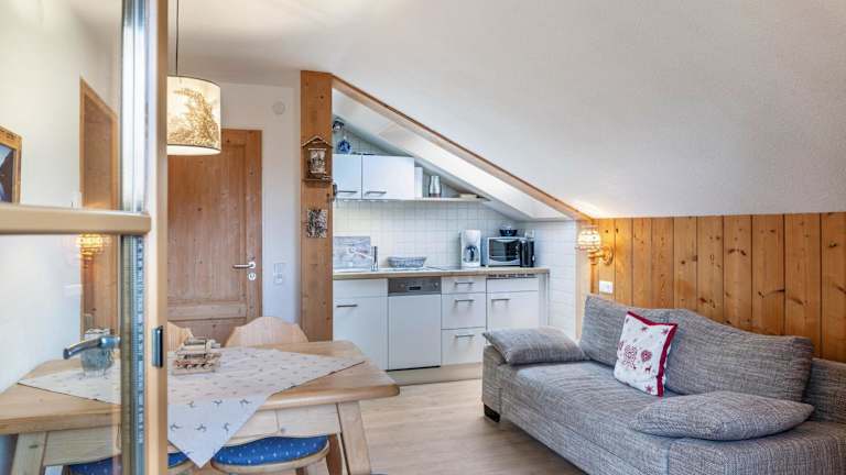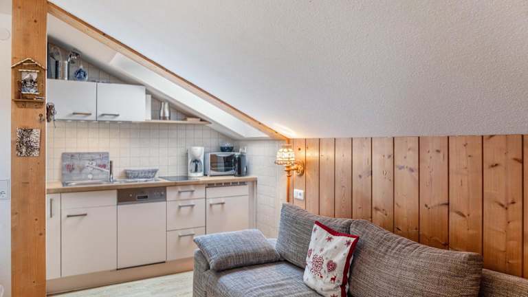 Die Ferienwohnung verfügt über einen Balkon mit Bergblick, ein Schlafzimmer, ein Wohnzimmer, einen TV sowie eine gut ausgestattete Küche mit Kühlschrank und Geschirrspüler. Zudem sind ein Badezimmer mit Dusche, Handtücher und Bettwäsche vorhanden.