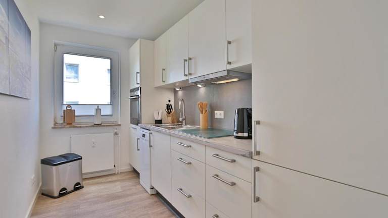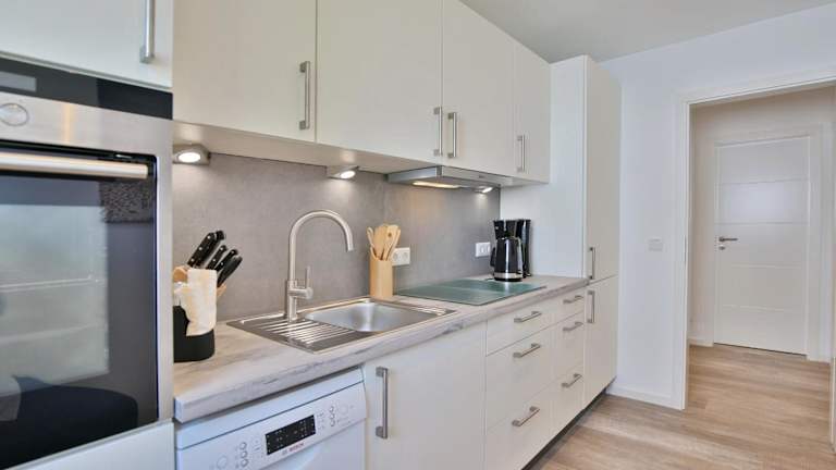 Die Ferienwohnung bietet eine voll ausgestattete Küche, die den Gästen die Möglichkeit gibt, eigene Mahlzeiten zuzubereiten.