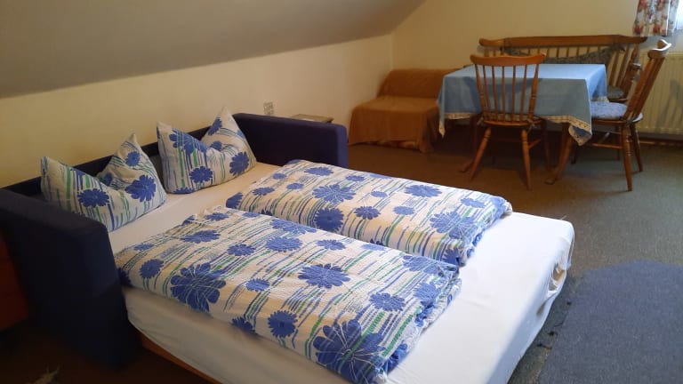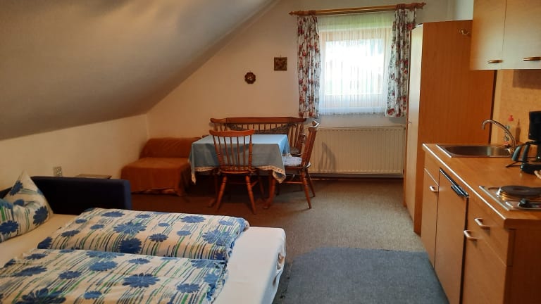 Die Ferienwohnung bestehend aus einem Wohnbereich mit einer Küchenzeile mit Ausziehcoach und einem sep. Schlafzimmer in Kaltenbrunn ist 7 km vom Garmisch-Partenkirchen entfernt in Richtung Mittenwald. Eine Küchenzeile mit Geschirr, Wasserkocher, Kaffeemaschine, Herd und Kühlschrank sind darin enthalten. Im Schlafzimmer ist ein Fernseher. Beide Zimmer sind mit einem eigenen Schlüssel abschließbar mit der man auch die Haustüre schließen kann. Über einen kleinen Flur erreicht man das Bad mit Dusche/WC. Handtücher werden gestellt. WLAN auf Wunsch. Parkplatz incl.