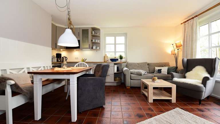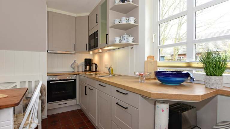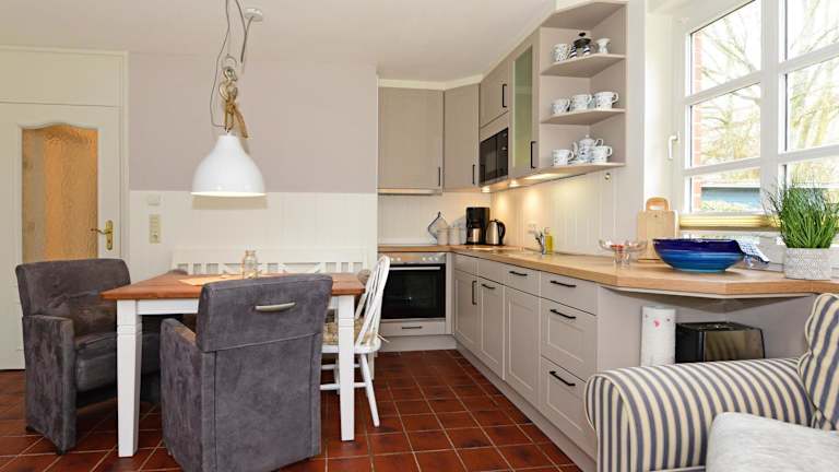 Die Ferienwohnung ist mit einer Küchenzeile ausgestattet, die einen Kühlschrank, Geschirrspüler, Ofen, Kaffeemaschine sowie Wasserkocher umfasst.