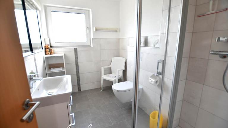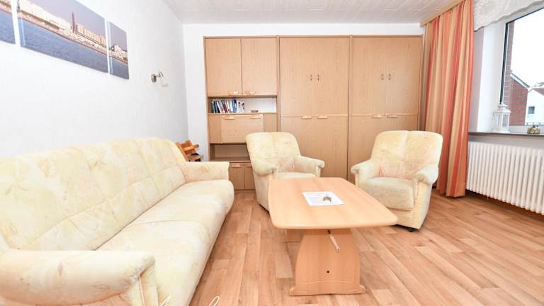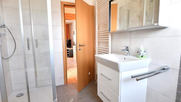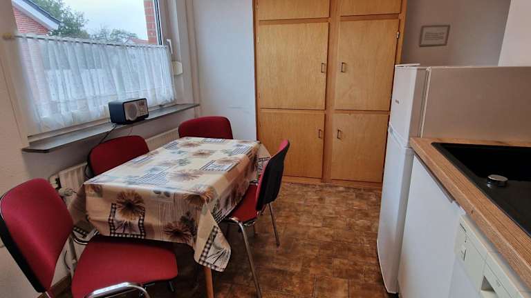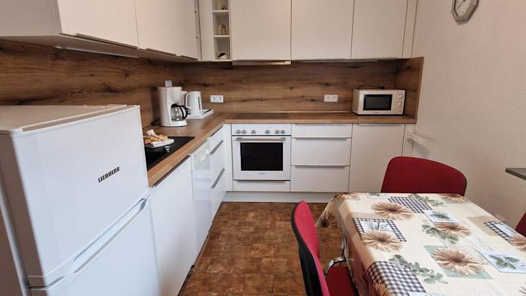 Die Ferienwohnung umfasst ein Schlafzimmer, ein Wohnzimmer mit TV, eine voll ausgestattete Küche mit Kühlschrank und Geschirrspüler sowie ein Badezimmer mit Dusche. Handtücher und Bettwäsche werden bereitgestellt.