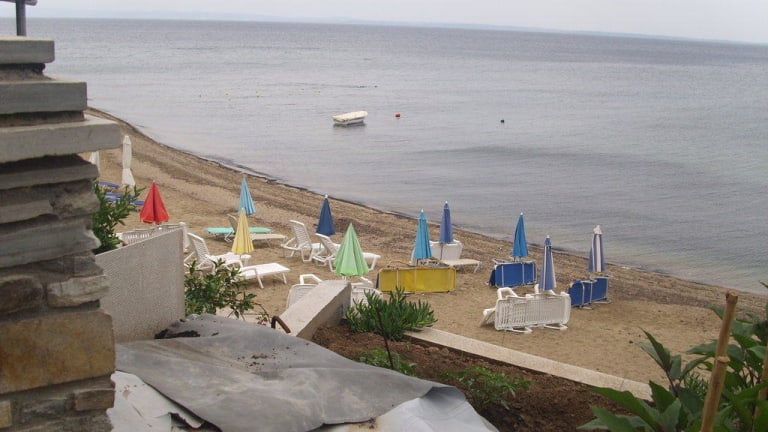 Das Haus des Vaters ist eine der besten Anlagen, die wir im Angebot haben. Der Inhaber führt das Haus nach deutschen Maßstäben. Er hat das Hotel in den 90ern ursprünglich für sich und seine Kinder gebaut und ausgestattet. Inzwischen haben sich die Kinder in anderen Berufen entwickelt und leben heute in Thessaloniki. Nur dadurch sind wir in der Lage, Ihnen dieses einmalige Haus anbieten zu können. In einer malerischen Bucht zwischen dem 1 Finger der Chalkidiki (Kassandra) und der Mönchsrepublik Athos gelegen verfügt das Haus über direktem Strandzugang. Bis zum Meer sind es nur 5 Meter. Die Bucht ist windgeschützt und bietet puderfeinen weißen Sandstrand. Es handelt sich um eine außergewöhnliche schöne Umgebung, die keine Wünsche offen läßt. Genießen Sie am Strand oder aber auf Ihrer Terrasse ein ausgiebiges Frühstück zum Sonnenaufgang oder ein Glas Wein zum Sonnenuntergang, beides wird unvergesslich bleiben. Parkplätze für den mitgebrachten Wagen oder aber für den Leihwagen sind am Haus vorhanden. Eine großartige Möglichkeit in Griechenland Urlaub zu machen, wenn Sie wollen rund um die Uhr in Badekleidung. Der Strand und das Meerwasser sind auch im Jahr 2009 für ihre sehr gute Qualität mit der blauen Flagge ausgezeichnet worden. Rundum ein Urlaubsdomizil, das keine Wünsche offen läßt. Das bedeutet Sandstrand vom feinsten, türkis blaues Wasser und flach abfallende Strandabschnitte. Unser Büro ist nur ca. 800 m. vom Haus des Vaters entfernt, so dass wir mit all unseren Serviceleistungen und Angeboten zur Verfügung stehen. Der ortsansässige Bäcker Nikos Karpetis fährt täglich um ca. 9:00 Uhr mit seinem kleinen Lieferwagen das "Haus des Vaters" an, bietet backfrische Brötchen und andere Leckereien an. So können unsere Gäste jeden Morgen auf Ihren Terrassen oder Balkonen, mit Aussicht auf